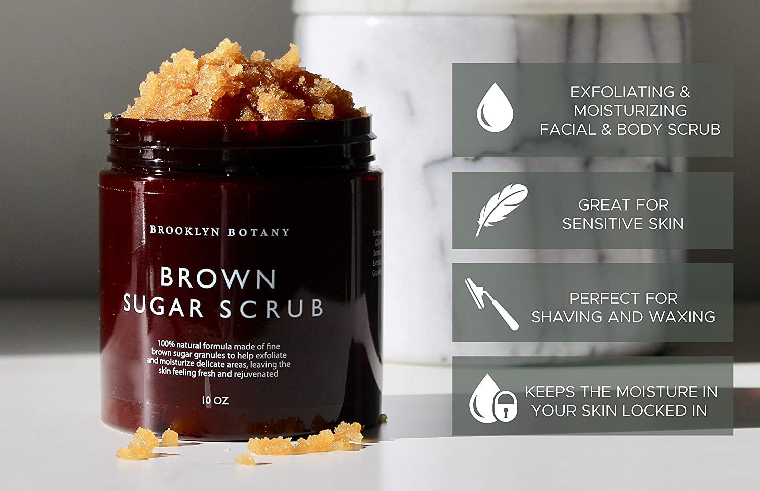 - NOURISHING MOISTURIZER: While certain exfoliating scrubs or dry brushes can leave your skin dry and dull, Brown Sugar Facial Scrub, Body Scrub, and Foot Scrub is actually moisturizing. Brown Sugar helps to keep the moisture in your skin locked in. It’s perfect for use before or after waxing and as a foot scrub.